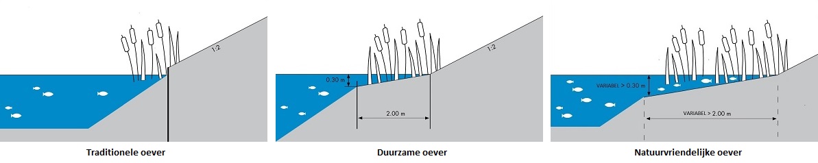 Maar wat is een duurzame oever eigenlijk en hoe draagt dit bij aan een gezonde waterkwaliteit? Een duurzame oever is geleidelijke overgang van water naar land met een flauw talud. Dat flauwe talud met een plateau, ook wel een plasberm genoemd, levert een bredere vaart op met een ondiepe rand, waarop waterplanten en macrofauna goed kunnen vertoeven en wat daarmee bijdraagt aan de ecologische waterkwaliteit, zoals beschreven in de KRW.